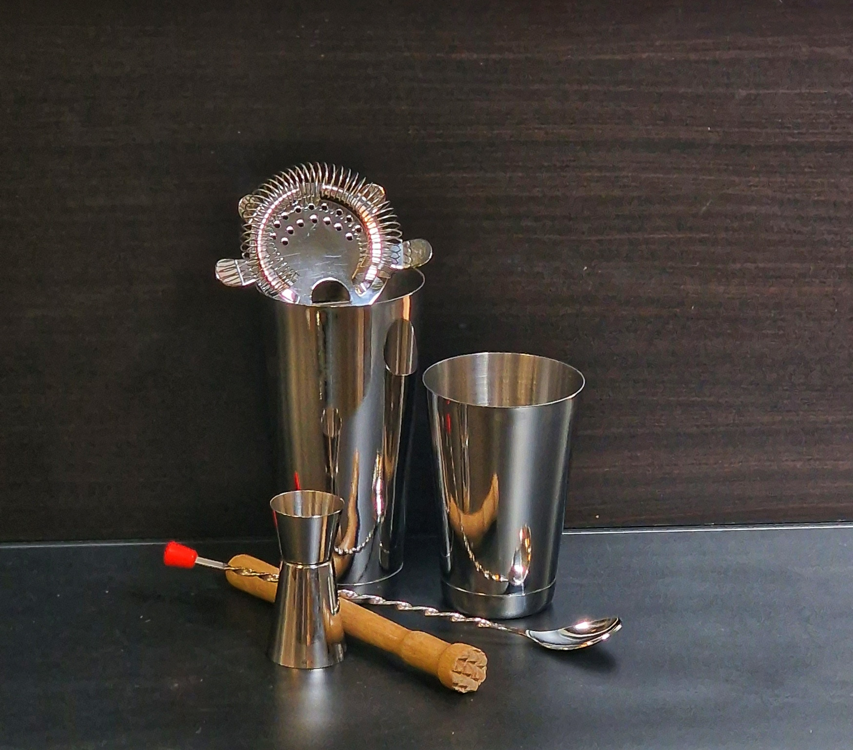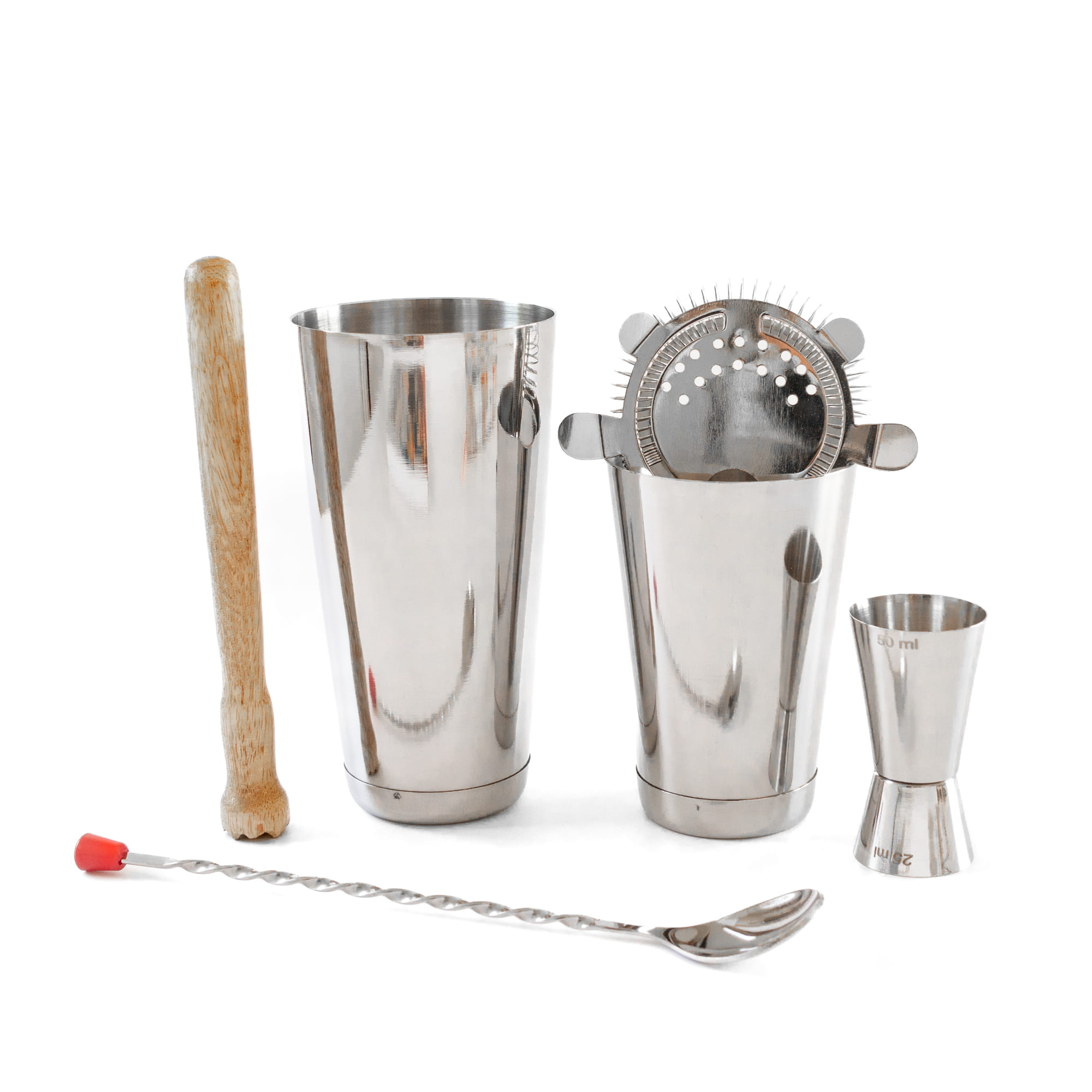 Cocktailset van roestvrij staal, bestaande uit 6 onderdelen: